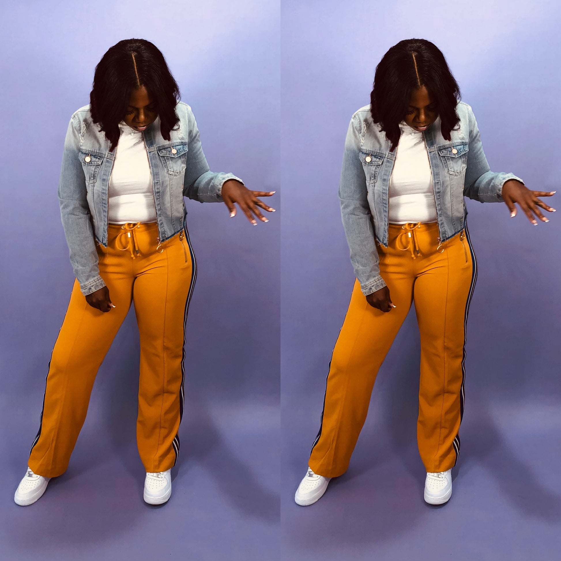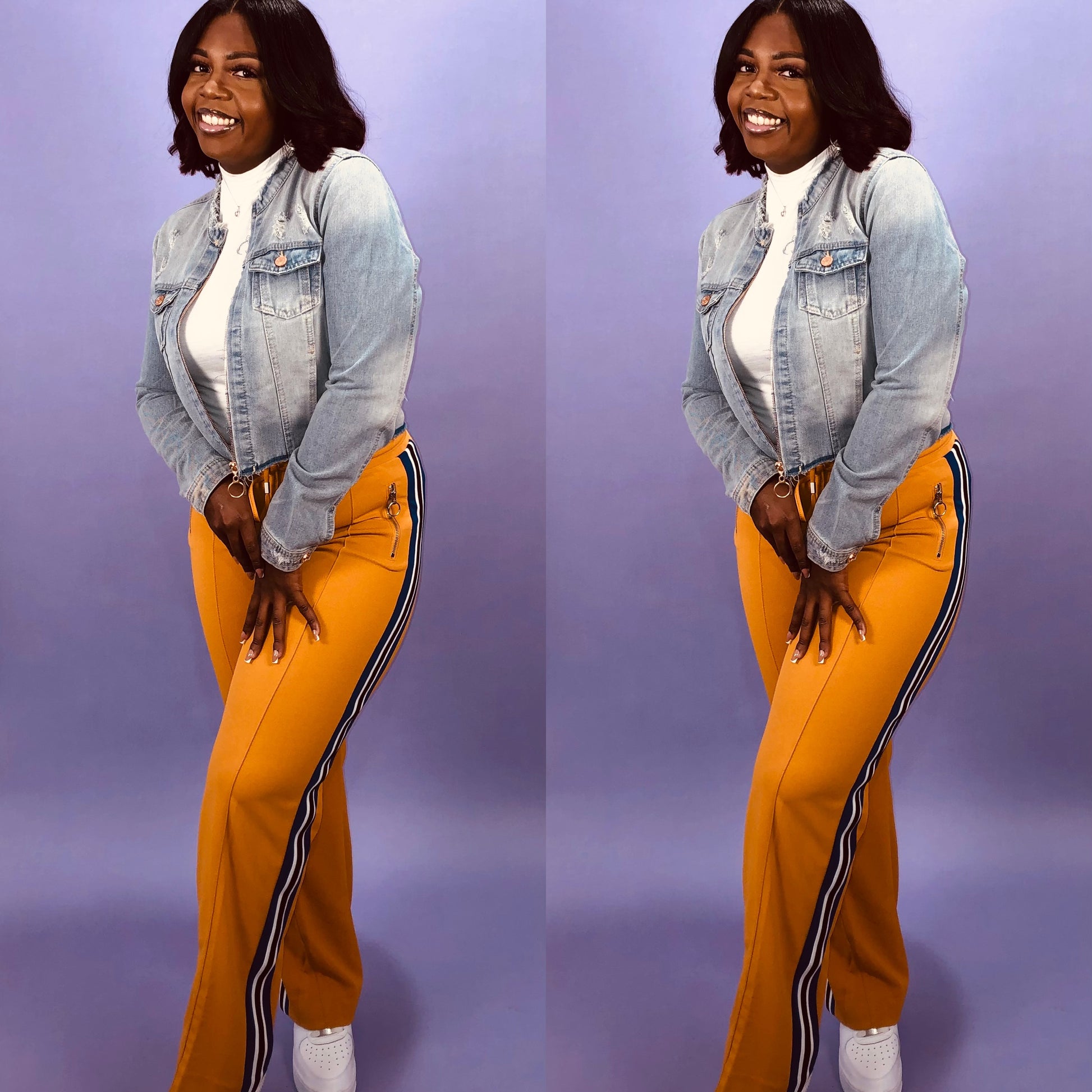 Make a bold statement with the Golden Groove Stripe Pants, featuring a striking three-color side stripe that’s as flattering as it is eye-catching. Equipped with zip-front pockets boasting edgy O-ring pulls and an elastic waistband with a self-fabric drawstring, these pants command attention while ensuring supreme comfort. Designed to be dressed up or down, they fuse daring style with versatility.